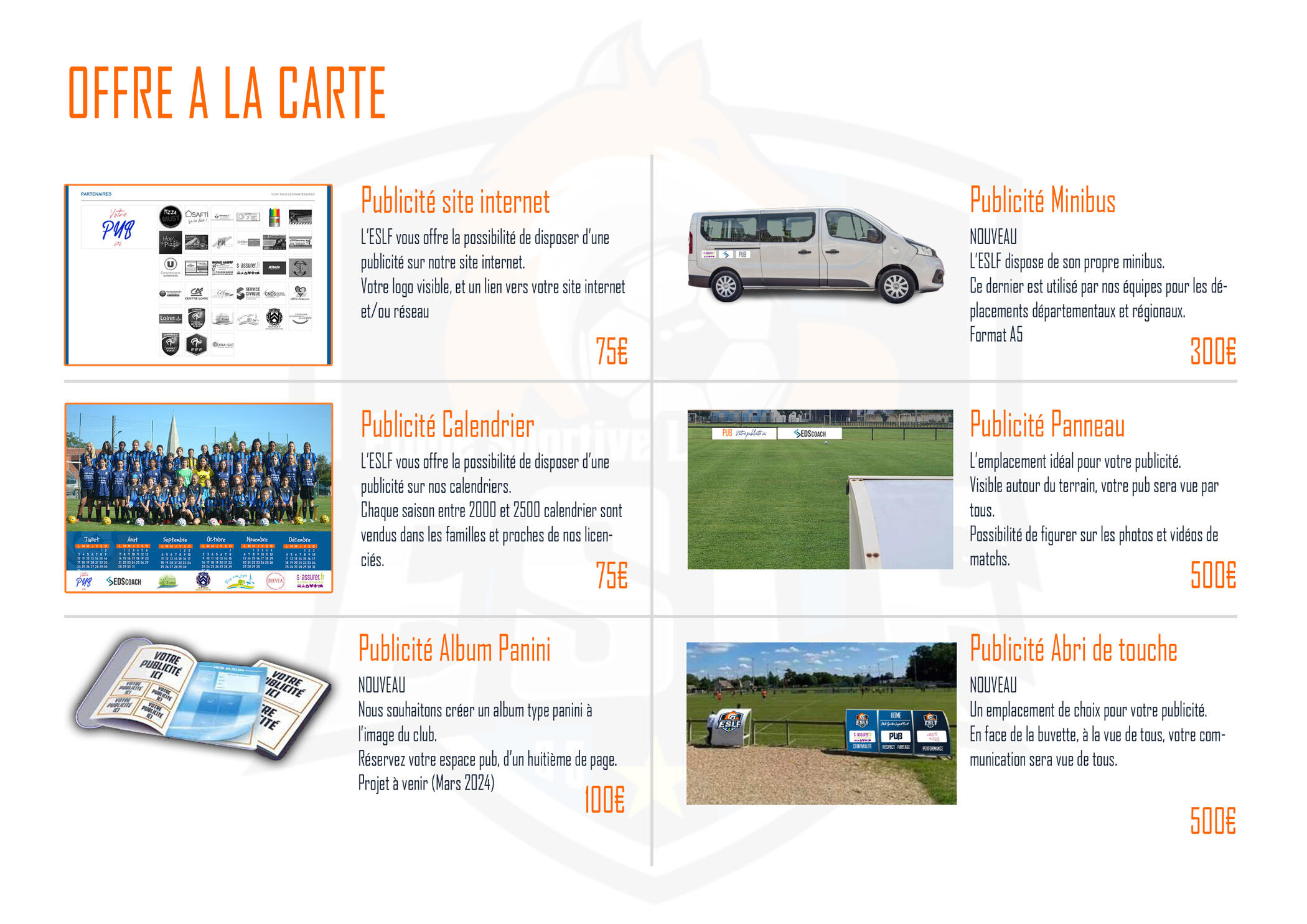 Votre contribution, au-delà de son impact financier, est un véritable moteur pour notre passion et notre détermination à continuer de grandir et d'exceller. Chaque don est une reconnaissance de la valeur que nous apportons à la jeunesse et à la collectivité, et nous nous engageons à poursuivre nos efforts pour donner le meilleur de nous-mêmes.Nous sommes fiers de vous compter parmi nos précieux partenaires et mécènes, et nous espérons que vous continuerez à partager cette merveilleuse aventure avec nous. Ensemble, nous construisons un avenir radieux pour le football amateur et nous donnons à chaque joueur l'opportunité de réaliser ses rêves.Encore une fois, un grand merci pour votre confiance et votre générosité. Votre soutien est la clé de notre succès, et nous sommes déterminés à vous montrer que chaque don compte, chaque geste fait une différence. Continuons ensemble à porter haut les couleurs de l'ESLF et à propager la joie du football dans notre communauté.Allez l'ESLF, Un club pour tous ! Tous pour un club !